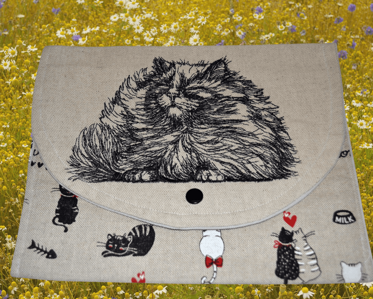 Pochette à rabat brodée, doublée. Confectionnée dans un tissu coton