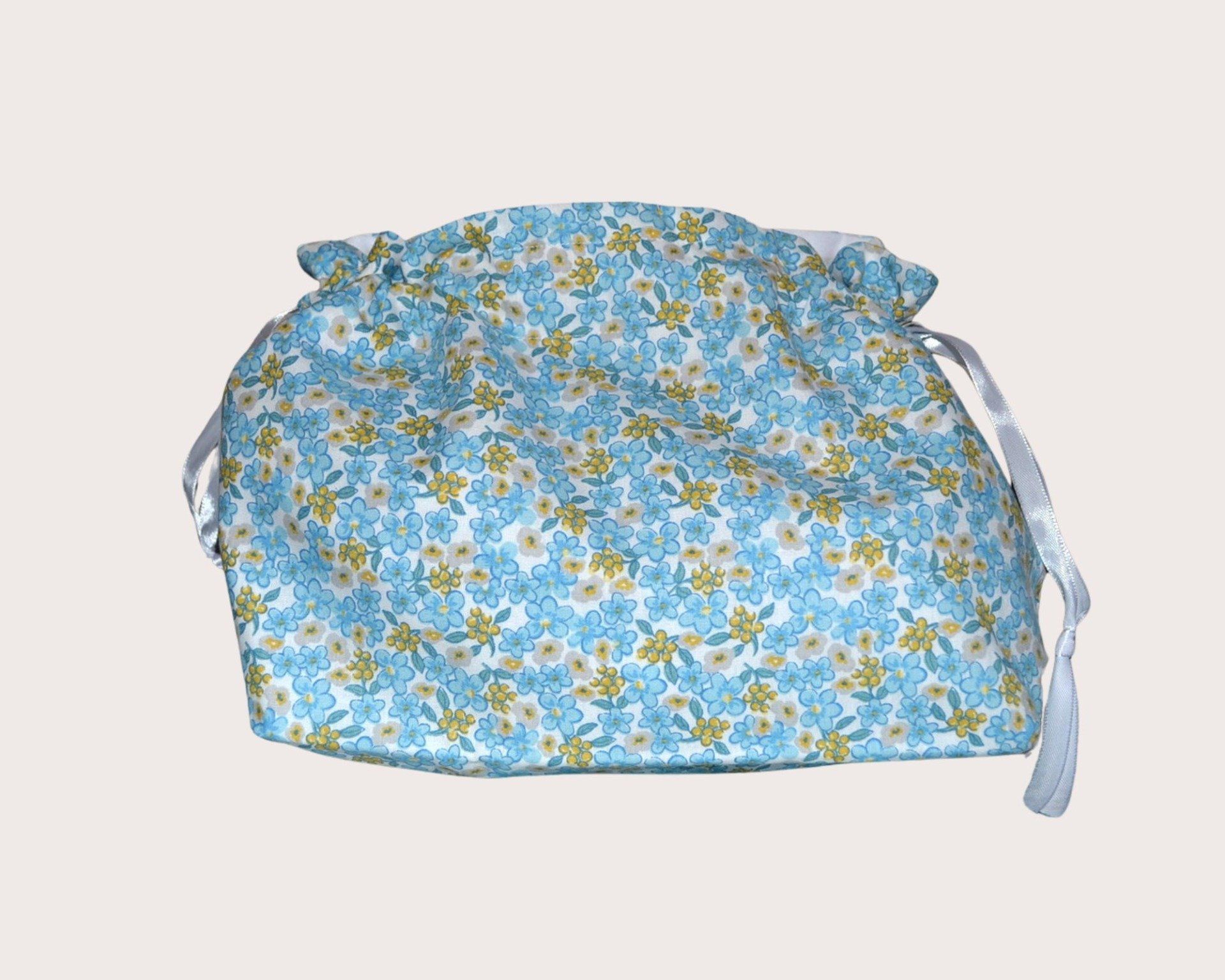 Confectionné en tissu coton imprimé et brodé sur tissu Burlington blanc. Doublé en tissu Burlington blanc.