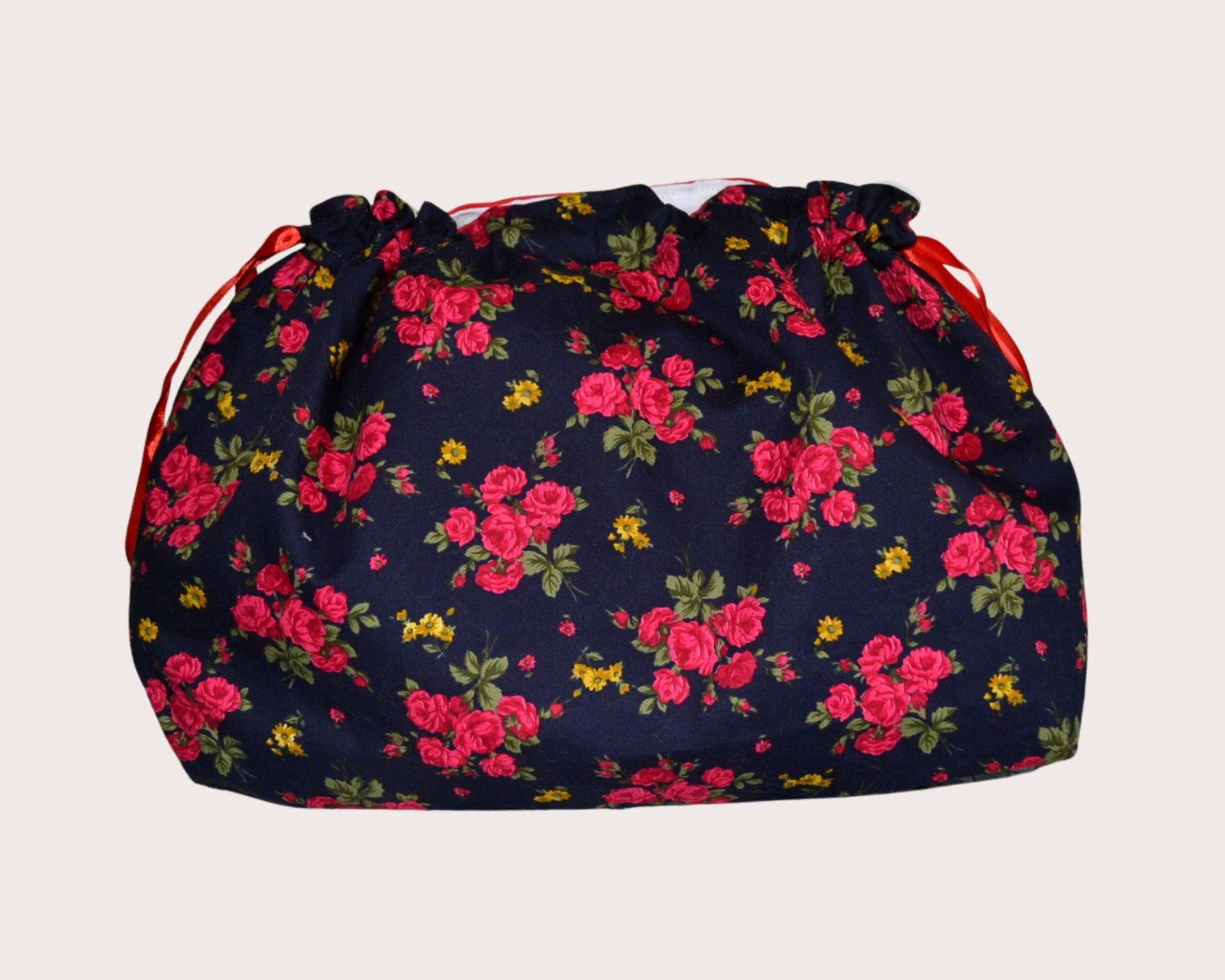 Confectionné en tissu coton imprimé et brodé sur tissu coton rouge. Doublé en tissu burlington blanc.